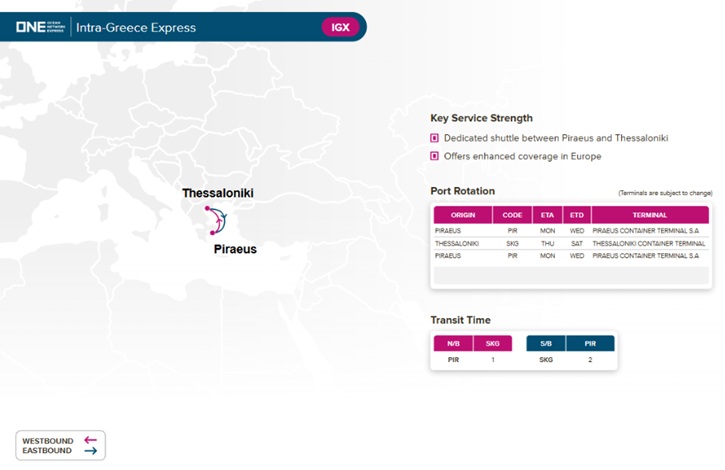 ヨーロッパ旅行日本郵船、商船三井、川崎汽船の邦船3社により2017年誕生したオーシャン・ネットワーク・エクスプレス(Ocean Network Express Pte. Ltd./ONE)は、今年4月7日からギリシャ国内で新たな定期航路サービス「IGX(Intra-Greece Express)」を開始した。