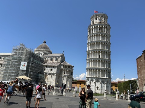 バイヌシマです。PISAの町に到着しました。7月初めなのにびっくりするぐらい暑いです。地元の人も、驚く暑さとか。まずはピサの斜塔へピサの斜塔のある公園まで、PISAの駅から町中を歩いて行きます。ビットリオ二世の像のある公園ここを過ぎると、中世の町並みが歓迎してくれます。車の入れない道にいなっていますので、安心して歩けます。中世からの市場パルテノン神殿のような建物が市場で、その横には、時計台のある旧市庁舎です。中はこんな感じ日本だったら完全に名所旧跡ですがPISAでは普通の生活の一部です。地下は、画廊になっていました。旧市街へさて、アルノ川を渡って、ピサの斜塔のある旧市街へと入ります。有名な方がお出迎えさて、旧市街の建物にはアーケードがあるので、熱い日差しが遮られ助かります。歩いて行くと、普通に立派な教会が!自由に中には入れるのが、素晴らしいですね。ちょっとのぞかせていただきましたが、立派です。さて、ピサの斜塔に行く前に、元PISAの王宮があった広場へとやってきました。ここが、PISAの政治の中心だったのですね。右が王宮、左がタワーです。昔クーデターが有、最後にクーデター派が負けて左の建物に閉じ込められて餓死させられたとか。どこにでも血なまぐさい歴史があるのですね。タワーのアーチを通って、ピサの斜塔に向かいます。ピサの斜塔!なんと言っても、PISAで一番有名なのはPISAの斜塔です。