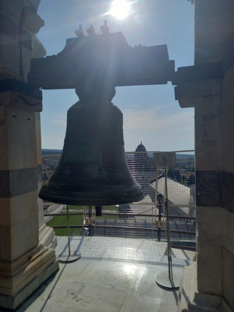 バイヌシマです。今年は早めの夏休みと言うことで、イタリアは、PISAへやってきています。ピサの斜塔へ登る!いよいよピサの斜塔に登ります。順番に並んで、中に入ると一階から塔の一番上を見上げることが出来ます。塔の内壁は、非常にシンプルですね。こちらで登る順番を待ちます。階段は、狭くて傾いています。ひたすら階段を上って!テラスへ階段の途中には、所々に窓がありますので、ここで一息つきます。途中の景色はこんな感じ。ついに、一番上のテラスに着きました。まあ、そこそこ狭いですが、景色は抜群です。一周しながら、トスカーナの景色が広がります。日向は暑いので、日陰に入るとほっとします。ピサの斜塔の頂上のテラスから屋内?に入ると、実は、天井はありません。そして、教会の鐘が周囲にあります。つまり、ピサの斜塔は鐘撞き堂、ベルタワーなのですね。ピサの斜塔の鐘にトスカーナの太陽が降り注ぎます。しばらくすると下りる時間です。下りも同じ階段を下りるしか有りません。狭い!ピサの斜塔に対して大聖堂の反対側には博物館ピサの斜塔と言えば、ピサの斜塔と大聖堂のセットで大聖堂の方向、左に傾いている構図を思い浮かべる方が多いと思います。反対側に回ったら、どんな具合に見えるのでしょうか?こちらが、反対側になる博物館です。この博物館には、大聖堂や、ピサの斜塔の外壁などから取り外した、オリジナルの物が保存されています。ほぼ全てが、大理