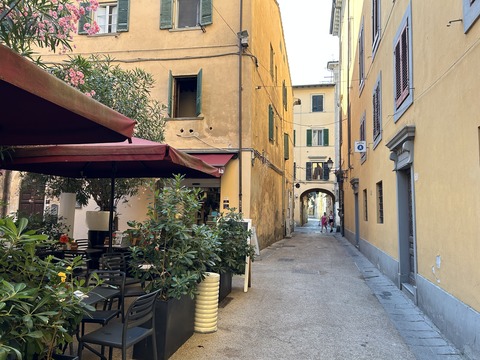 バイヌシマです。PISAのホテルのそばで昼食です。本日の昼食は、PISAの路地の奥の小さなピザ屋さんです。路地奥の小さなピザ屋La Taverna di Pulcinella本日の昼食は、町の小さなピザ屋さん。PISAの暑い昼下がり、12時過ぎに訪問しました。早速注文です。日本でも一緒ですが、こちらの店もスマホで注文になっていました。こちらは、生ハムののったピザ。こちらは、キノコのパスタです。PISAの町は、一歩裏道に入るとこんな感じ。数百年前からののんびりとした町並みが広がっています。もちろんこちらのお店、一枚一枚手作り、そして石窯で薪でピザを焼いています。店内からの風景は、こんな感じです。今日は、土曜日、お店には仕事の人はいませんので、12時頃は閑散としていましたが、お昼を過ぎてから、続々と地元のお客さんが訪れ、ワインとビールを片手に盛大に昼食が始まりました。こちらは、猛暑の中、ピサの斜塔に向かいましょう。