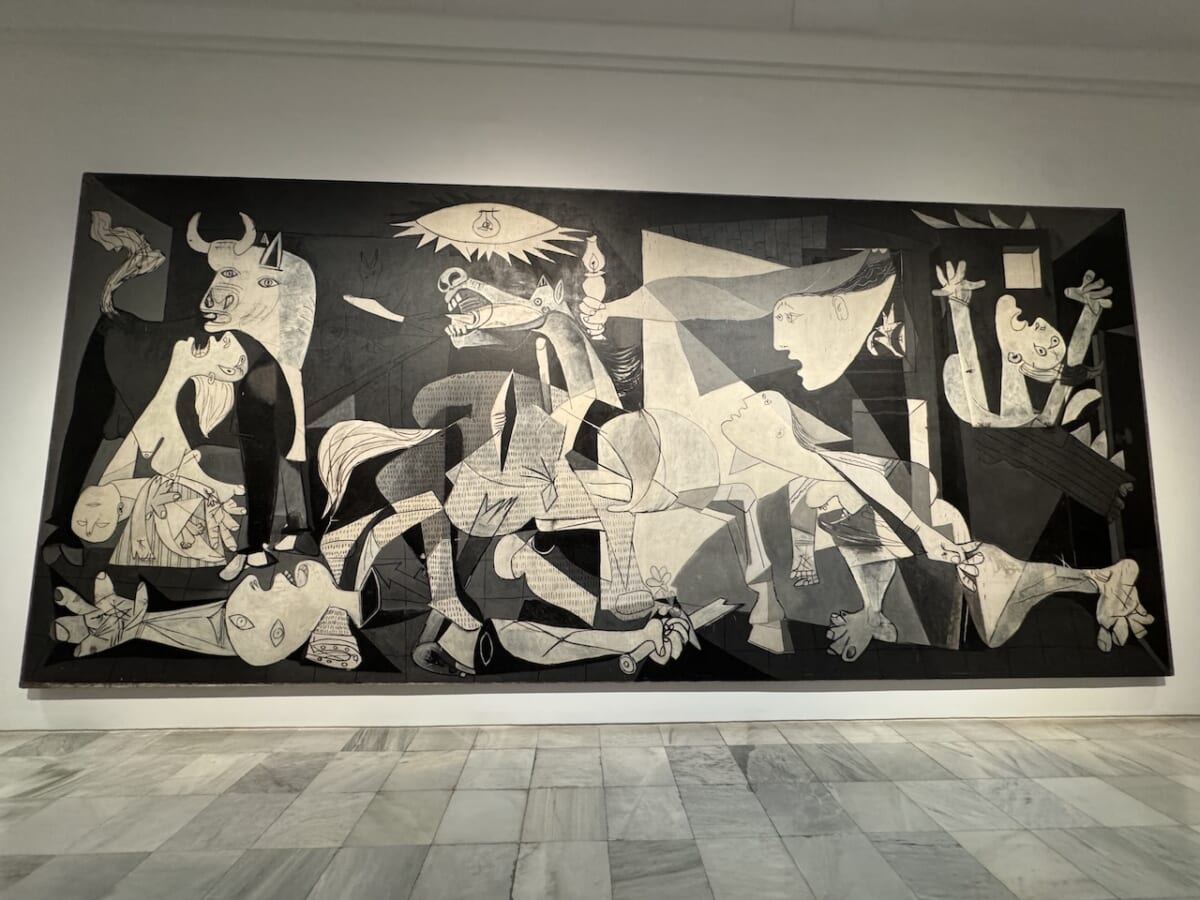 教科書などで見たことがあるという人も多いかもしれませんが、実物の迫力は想像を遥かに超えるもの。馬が口を開いて絶叫し、母が泣きながら赤ん坊を抱え、兵士の手がちぎれ、爆弾の光が眩しく照らす――ピカソ特有のキュビズムが極限まで悲劇を抽象化し、私たちの心に重く訴えかけてきます。この作品を見るだけでも、マドリードに来た価値があると言えるでしょう。