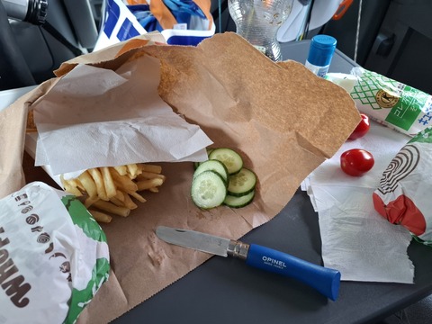 6月23日ー食目 昼食フランスヘ向かう途中、まだドイツのサービスエリアにてバーガーキングのワッパーとポテトきゅうりとトマト旅の始まりの食事の定番になりつつあります。きゅうりとトマトを追加しています。二食目 夕食ランスのサービスエリアにて鮭のおにぎり(尾西の携帯おにぎり)豆腐の味噌汁、梅干し、魚肉ソーセージ、平桃、バナナちょっと夜遅くなってしまったので軽目の食事です。デザートはこの時期しか食べられない大好きな平桃です!6月24日三食目 朝食ランスのサービスエリアにてクロワッサン、パン・オ・レザン、パン・オ・ショコラ、生ハム、七面鳥ハム、ゆで卵、トマト、きゅうり、バター、メープルシロップ、コ―ヒー、平桃、バナナフランスならではのお楽しみ~クロワッサン!!できる限り朝食はクロワッサンでレーズン入りもチョコ入りも美味しい~四食目 昼食ランスからシャンボール城へ向かう途中にあるサービスエリアにてバゲット、ゆで卵、トマト、きゅうり、生ハム、バター、メープルシロップ、プラムジャム、オレンジの炭酸飲料、コーヒー、平桃サービスエリアのパン屋でバゲット購入!!美味し過ぎる~五食目 夕食トゥールのサービスエリアにて魚介のサラダ、きゅうりとミントのガスパチョ、鴨のパテ、牛のステーキ、ガーリックバター、バゲット、バター、タルトタタン、↑これ、おっちゃんの大好きなパテ。フォアグラも入ってて美味しい。