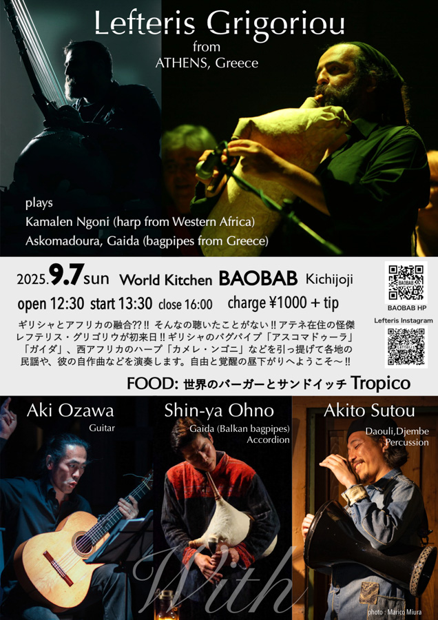 今回の初来日公演は9月7日(日)東京・吉祥寺のWorld Kitchen BAOBABで開催。グリゴリウがアスコマドゥーラ、ガイダ、カメレ・ンゴニ、ダウリ(バルカン〜トルコの両面太鼓)ジェンベ、歌を、大野 慎矢(LYAGAS,トラぺ座, PISMO)がガイダ、トゥルミを、小沢 あき(LYAGAS, 星の飛ぶ夜, 石橋幸)がガットギター、12弦ギターを、須藤 昭人(LYAGAS, Almenialva, Zionhill Session)がダウリ、ジェンベ、歌を担当。各地の民謡や、グリゴリウの自作曲などが演奏される自由と覚醒の昼下がりとなる。