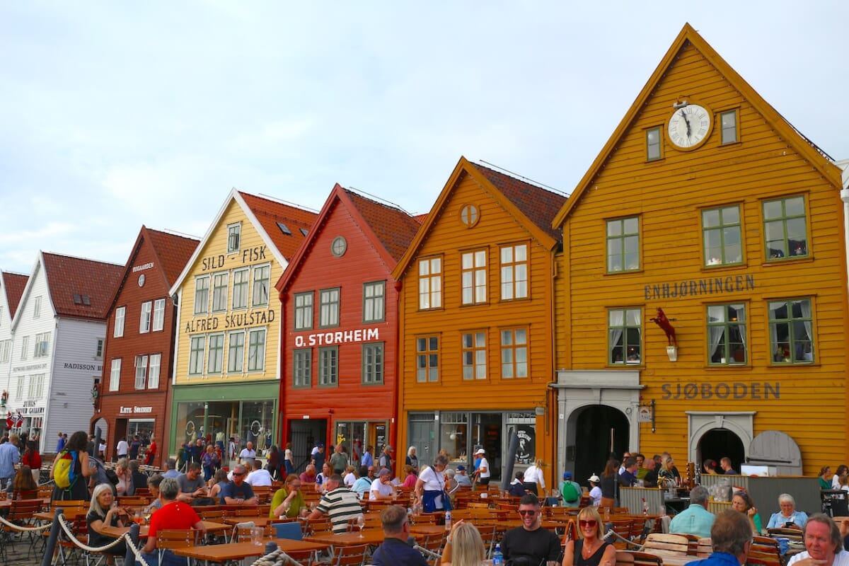 ベルゲンが『アナと雪の女王』のモデルの1つと言われる最大の理由は、その象徴的な景観にあります。港に面してカラフルな三角屋根の木造家屋が連なる「ブリッゲン地区」は、ハンザ同盟時代にドイツ商人たちの商館として栄えた場所。